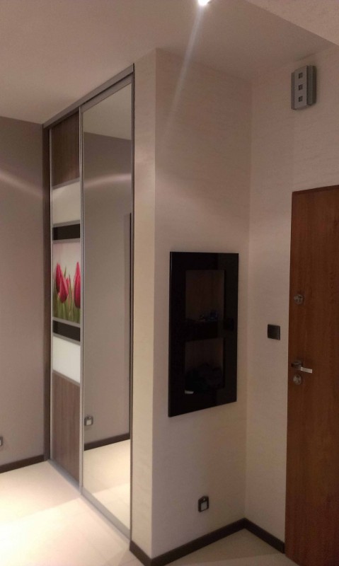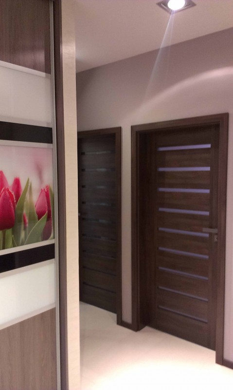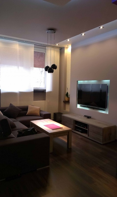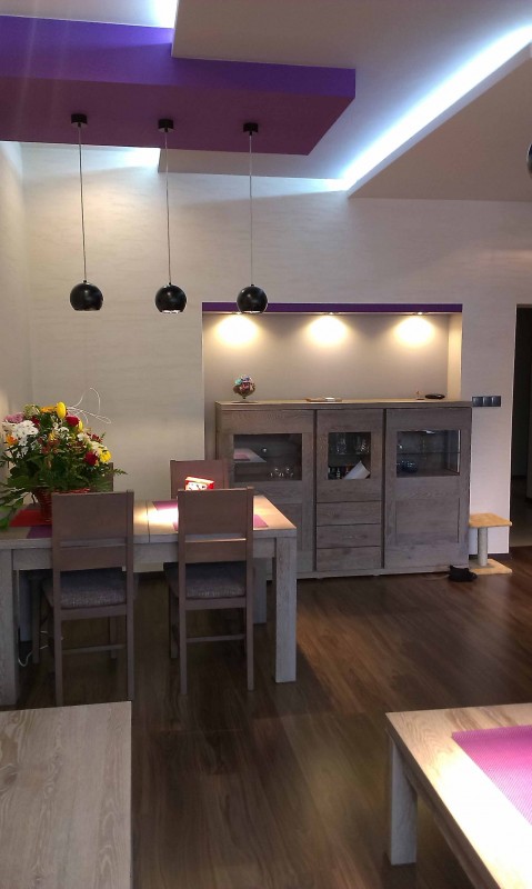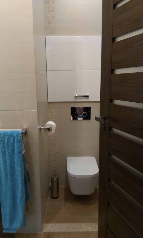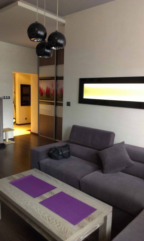 Mieszkanie z rynku wtórnego z Sosnowca. Wyzwaniem były wysokie ponad 3 m pomieszczenia z oknami prawie dotykającymi sufitu, położonymi 125 cm nad podłogą, a dla wykonawców brak kątów prostych. Zabudowy i podświetlenia powstały na życzenie inwestorów. We wnętrzu szarość połączona z naturalnymi kolorami trawertynu i drewnianej podłogi tworzy ciepły klimat. Fioletowe akcenty dodają wnętrzu charakteru. Łazienka w ciepłych naturalnych kolorach.